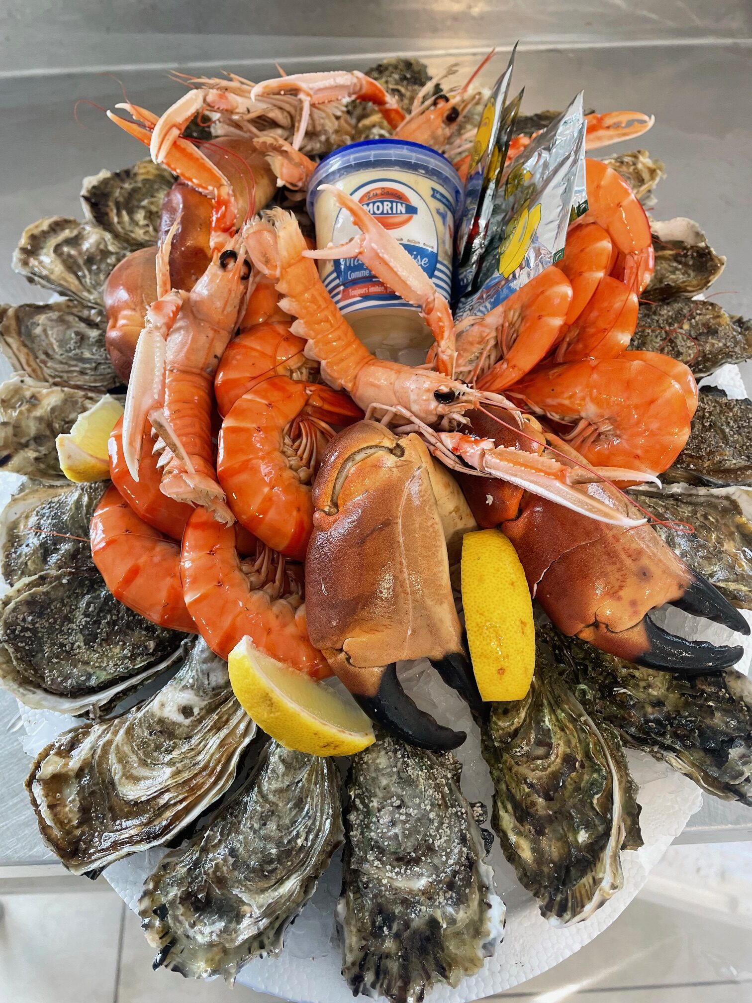 6 Huîtres n°4 • 1 pince de crabe • 2 Langoustines • 6 Bulots • 5 Crevettes Roses cuites maison • Bigorneaux • Crevettes grises ou blanches